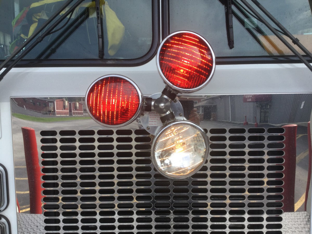 In 1971, retired Fairfax County firefighter Richard Slepetz acquired the patent rights for $500 at Grether's estate auction. He revived the Roto-Ray in 1978 with his first prototype, initially modifying a Seagrave pumper for Fairfax County Fire/Rescue by flush-mounting it on the cab face. This innovation sparked demand, leading to the founding of Roto Rays Inc. in Herndon, Virginia. Slepetz hand-built the lights, introducing updates like front-mount options for various apparatus builders (e.g., Seagrave, Pierce, E-One), LED integrations (models 1000 and 4000 with PAR 36/46 LEDs), a "stop and flash" feature, and consistent 180 RPM rotation speeds. A classic Roto-Ray installation looked like this:
